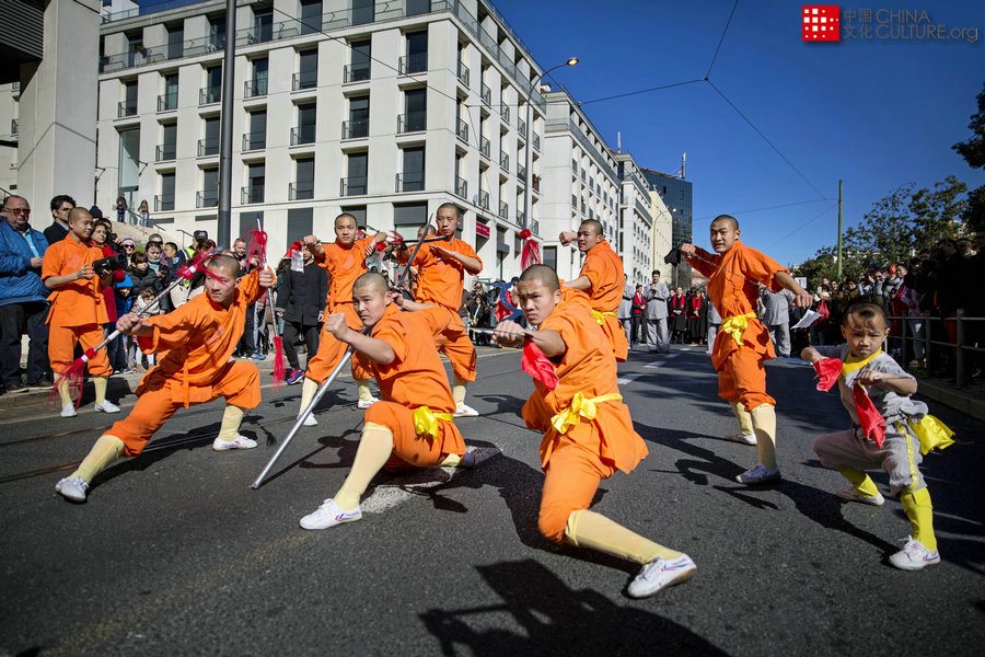 2018年2月10日,在葡萄牙首都里斯本市,來(lái)自少林寺的武僧在游行時(shí)表演中國(guó)功夫。[攝影:鄭英杰]