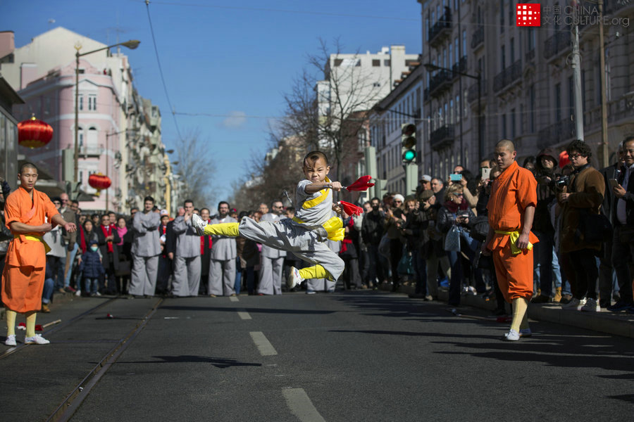 2018年2月10日,在葡萄牙首都里斯本市,來自少林寺的小武僧高幸福在游行時表演中國功夫,驚呆全場。[攝影:鄭英杰]