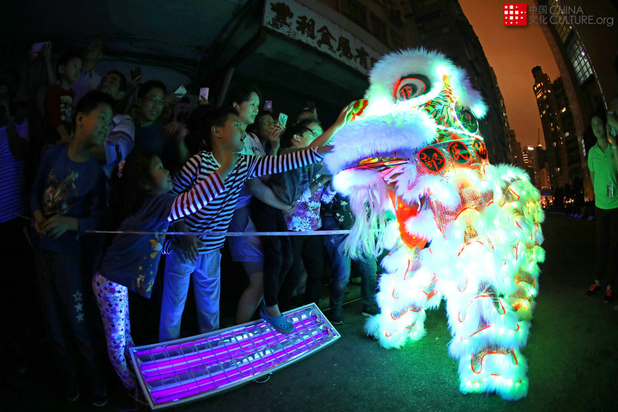 新年期間,香港市民和旅客一同欣賞晚間醒獅表演,歡度春節(jié)。[攝影:黃志強(Wong Chi Keung)]