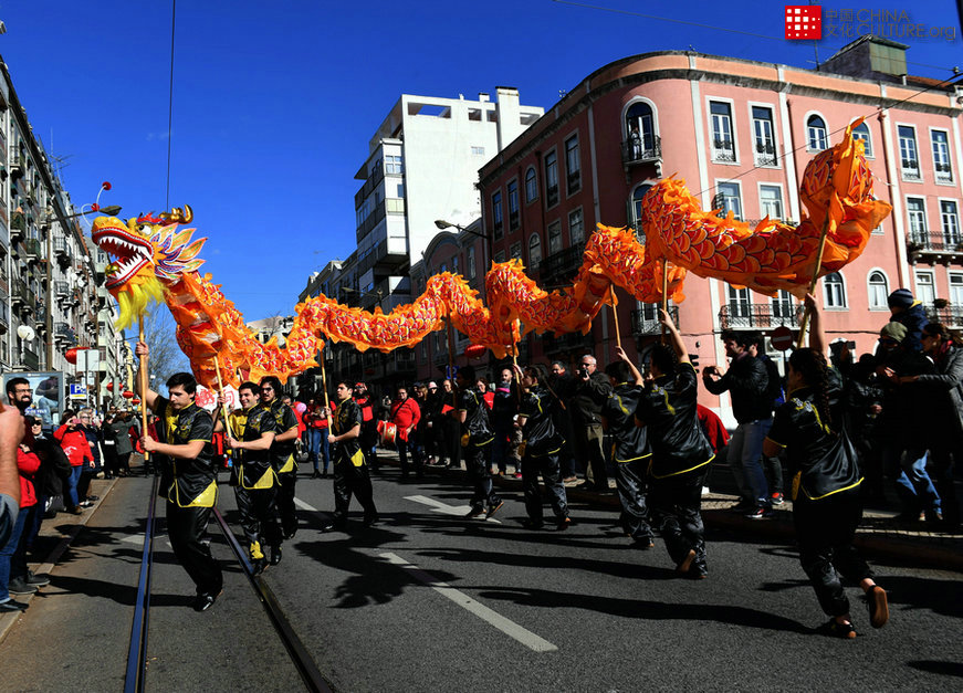 2月10日,在葡萄牙首都里斯本市,葡萄牙阿威羅大學(xué)的學(xué)生在“歡樂春節(jié)”活動中表演舞龍。[攝影:張立云]