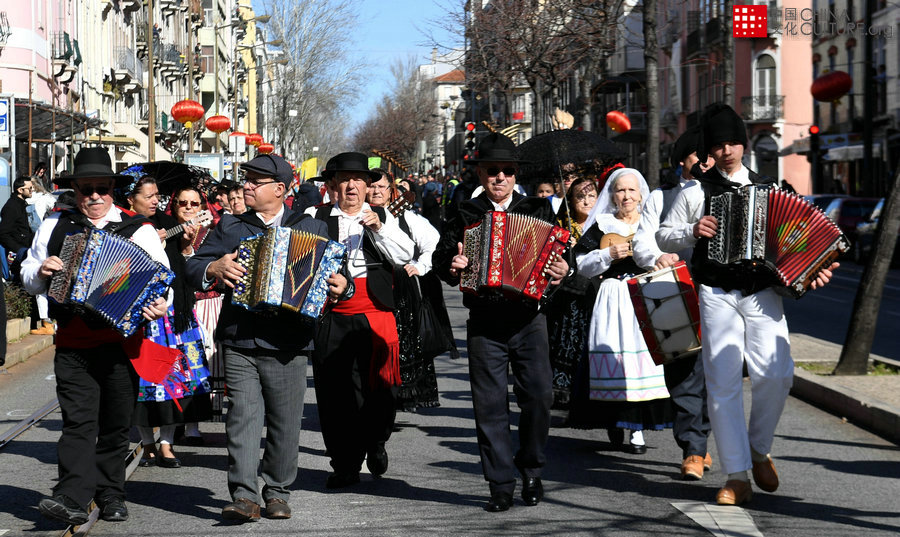 2月10日,在葡萄牙首都里斯本市,葡萄牙米尼奧歌舞團的演員在“歡樂春節(jié)”活動中表演。[攝影:張立云]