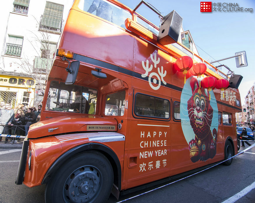 2月18日,馬德里中國(guó)城——烏塞拉區(qū)隆重舉行春節(jié)廣場(chǎng)巡游,一輛印有歡春LOGO的雙層大巴帶領(lǐng)巡游隊(duì)伍穿遍大街小巷。[攝影:Adolfo Barroso Simon]