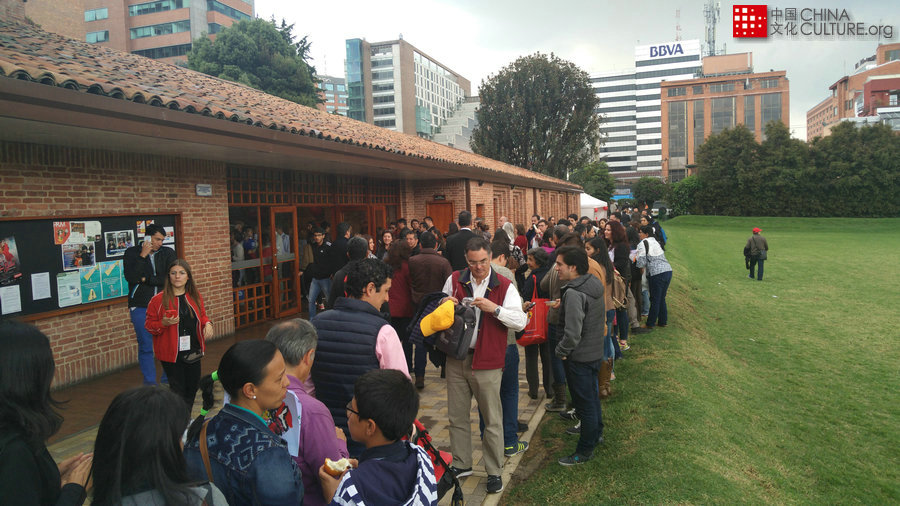 在廟會的劇院門口,哥倫比亞民眾充滿期待的等待天津青年京劇團(tuán)和貴陽歌舞團(tuán)的精彩文藝演出。[攝影:孫志恒]