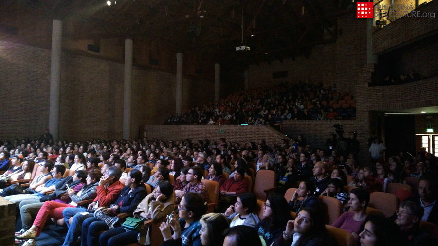 當?shù)赜^眾津津有味的觀看聆聽天津青年京劇團帶來的京劇選段。[攝影:孫志恒]