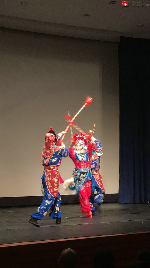 京劇《青石山》選段中精彩的打斗場(chǎng)面引得臺(tái)下觀眾贊嘆不止喝彩不斷。[攝影:孫志恒]