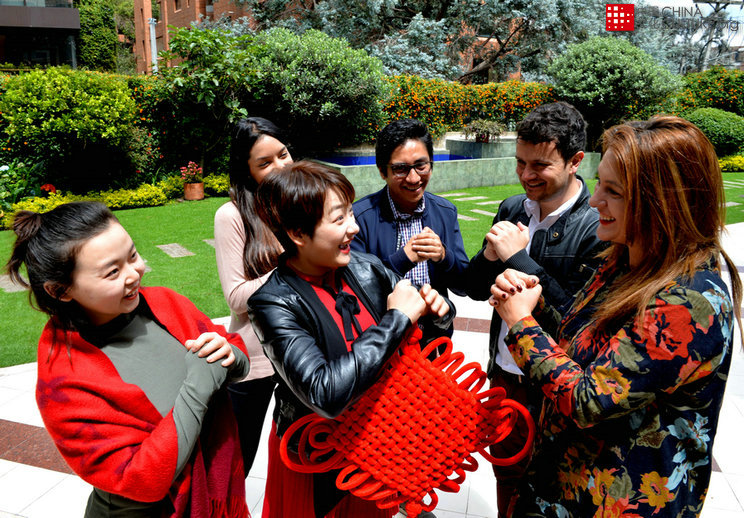 哥倫比亞孔子學(xué)院老師學(xué)生用流利的中文給不遠(yuǎn)萬里來到哥倫比亞的演員們“拜年啦”。[攝影:孫志恒]