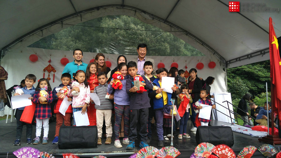 歡樂春節(jié)廟會上的漢語課堂班的小朋友同駐哥倫比亞大使一起賀新春慶新年。[攝影:孫志恒]