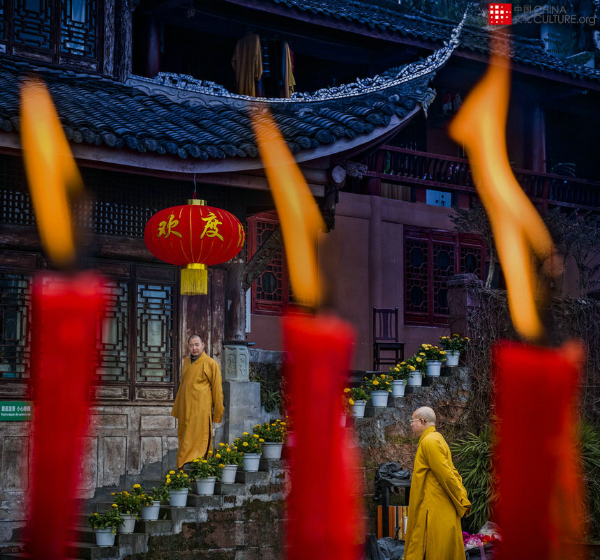 2018年2月17日正月初二早晨,四川樂山烏尤寺,清幽的寺院里也掛起了歡慶春節(jié)的紅燈籠,紅蠟燭燃著金黃的火苗,在等著來膜拜的人們,佛門境地也有了節(jié)日的氣氛。[攝影:王國臣]
