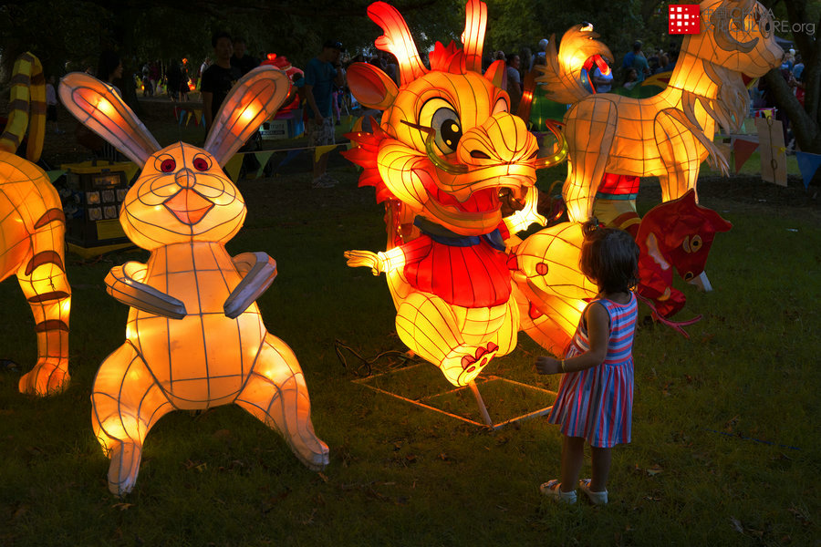小女孩對十二生肖花燈非常好奇,湊近距離觀看。[攝影:彭炯新]