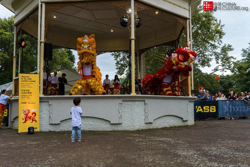 小朋友被燈會(huì)場(chǎng)內(nèi)的中國(guó)醒獅吸引,走到舞臺(tái)跟前觀看。[攝影:彭炯新]