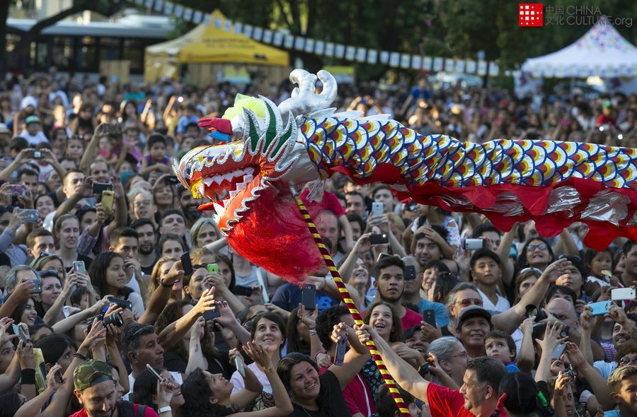 Residents react during the "Dance of the Dragon" as part of the celebration of the Chinese Lunar New Year at the Plaza National Parks in Buenos Aires, Argentina, on February 10, 2018. The Chinese community in Buenos Aires welcomes the year 4,716 of its lunar calendar, year of the Land Dog, with an event that awaits some 6 thousand people to enjoy the art, culture and millenary disciplines. [Photo by Martin Miguel Zabala]