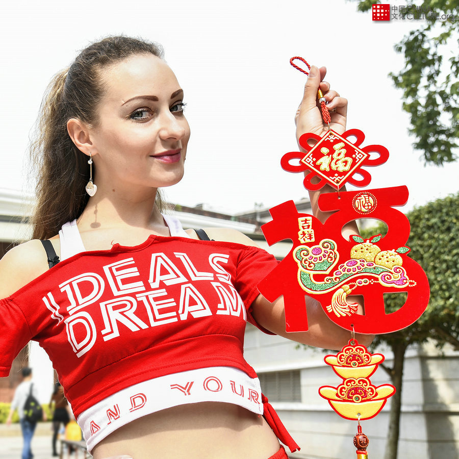 2018年,深圳世界之窗,外籍姑娘手提中國(guó)福字高興的說“福來了”。[攝影:劉麗]