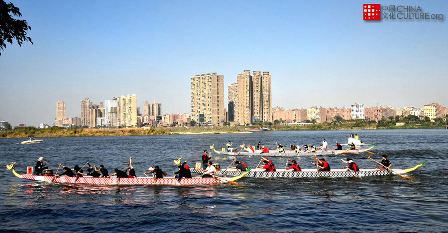 2018年2月25日,“歡樂春節(jié)”尼羅河龍舟大賽在開羅皇家穆罕默德·阿里俱樂部舉行。河面上龍舟飛馳,你爭(zhēng)我趕。選手們奮力揮槳,勇爭(zhēng)優(yōu)勝。[攝影:王文驍]