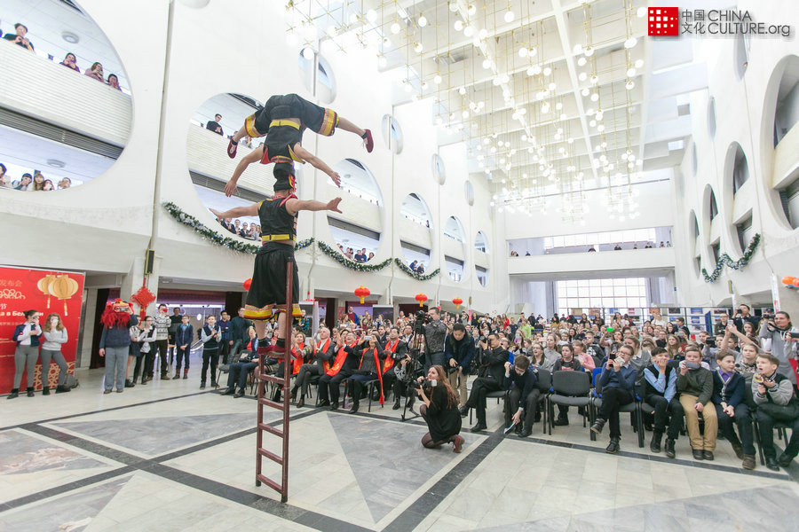 白俄羅斯2018年歡樂春節(jié)文化廟會活動現(xiàn)場,雜技節(jié)目《追愛》引得觀眾們的陣陣驚嘆和歡呼。[攝影:中國駐白俄羅斯使館文化處、明斯克中國文化中心]