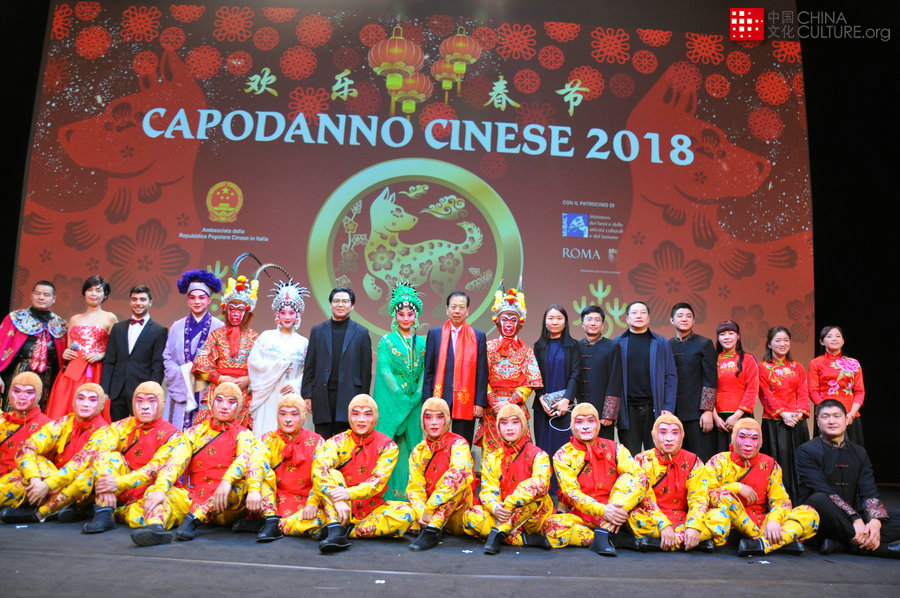 2018年2月99日,意大利羅馬舉辦“歡樂春節(jié)”演出活動,中國駐意大利大使李瑞宇與參演人員合影。[攝影:張凌霄]