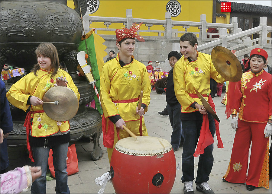 在江蘇常州天寧寶塔廣場上,來自英、法等國家的交流學(xué)生與市民們一起歡快喜慶中國佳節(jié)。[攝影:姚建國]