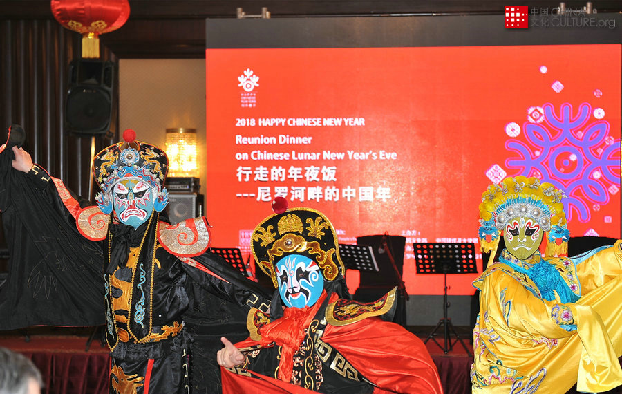 及2018“歡樂春節(jié)”-行走的年夜飯,中國四川藝術(shù)團三位師傅為中外嘉賓集體表演變臉。[攝影:馬宏武]