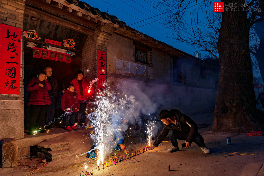 2017年2月8日,山東省煙臺(tái)市川里林家村,村民在百年老巷口放煙花慶新春。[攝影:紀(jì)天勝]