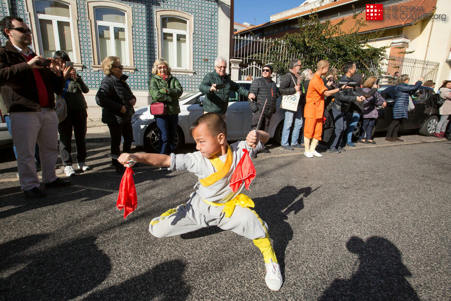 2月10日上午,葡萄牙首都里斯本舉行了歡樂春節(jié)盛裝巡游活動,河南文化藝術團組成的舞蹈和武術表演方陣,受到了華人華僑和當?shù)孛癖姷臒崃覛g迎。[攝影:李知鴻]