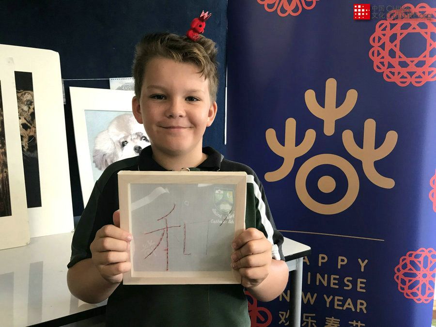 惠靈頓圣約瑟夫?qū)W校男生展示中國非遺傳承人指導(dǎo)的“和”字靺鞨繡作品。[攝影:方華]