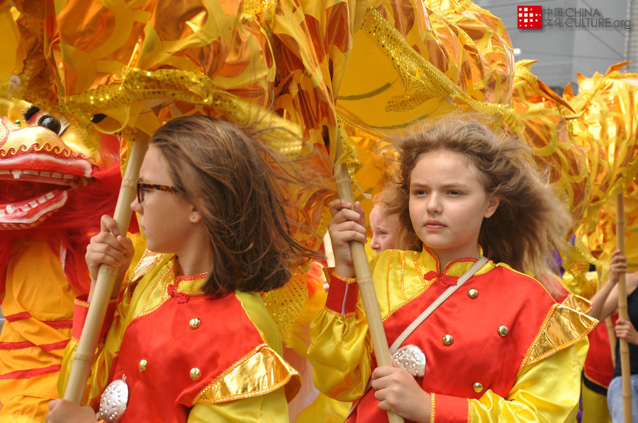 惠靈頓東方女子中學(xué)女生專注于中國(guó)舞龍表演。[攝影:方華]