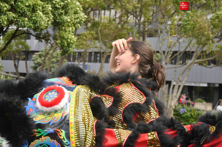 惠靈頓東方女子中學(xué)女生傾情加入中國(guó)新年花車巡游舞獅隊(duì)。[攝影:方華]