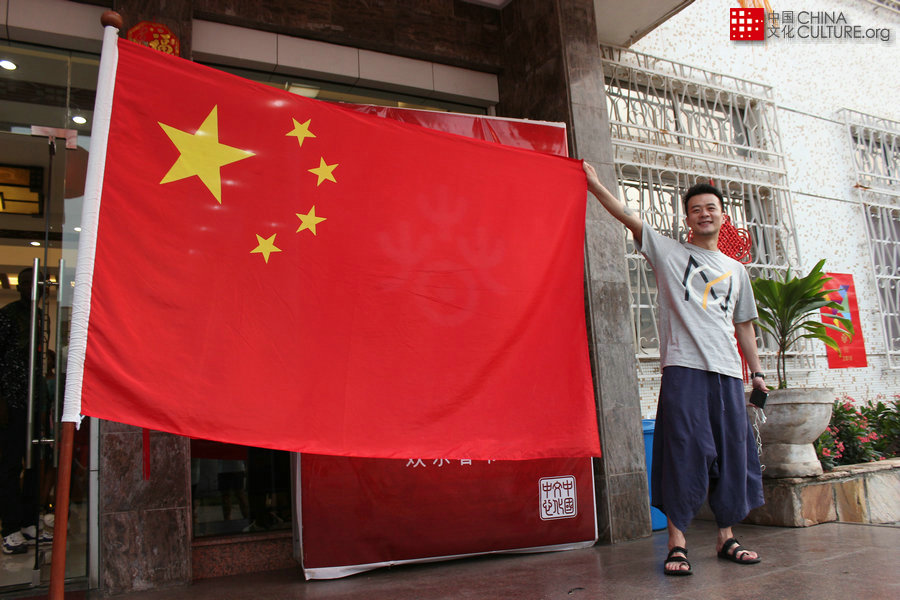 Artist of GUIZHOU troupe poses with the Chinese flag on the day of the official launch of the Chinese New Year party. [Photo by Zounyekpe Coffi Seraphin]