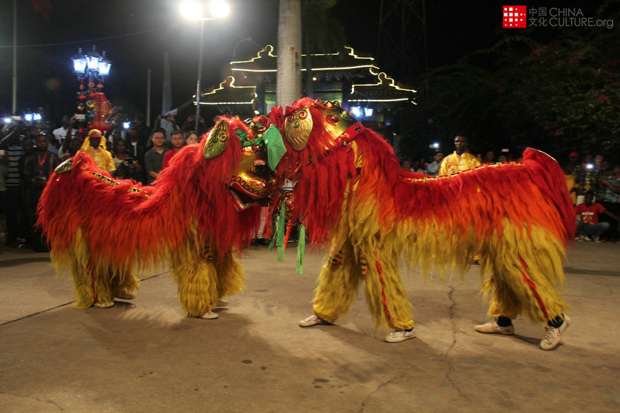 Lion dance in front of guests on the official launch day of Chinese New Year holiday. [Photo by Zounyekpe Coffi Seraphin]