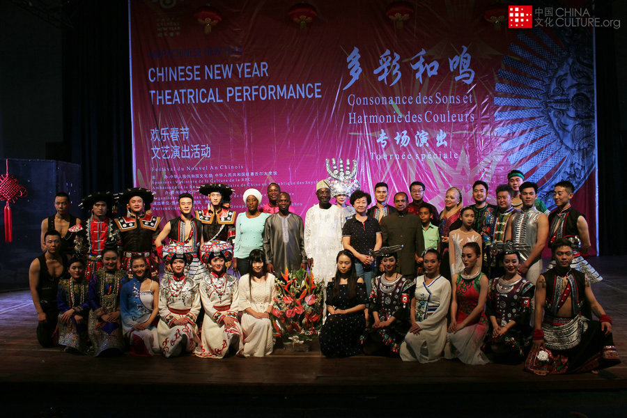 Guizhou Art Troupe pose for a group photo after the performance at the FITHEB Hall in Cotonou. [Photo by Zounyekpe Coffi Seraphin]