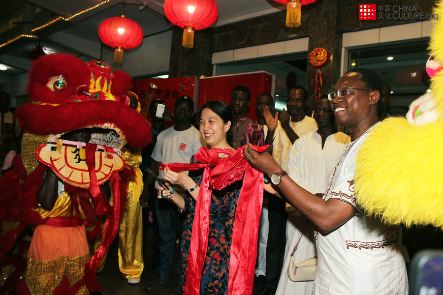 Ms. Li, Charge d'Affaires at the Chinese Embassy near Benin (left) and Mr. Richard SONON, Secretary General of the Ministry of Culture cut the ribbon at the Chinese Spring Festival. [Photo by Zounyekpe Coffi Seraphin]