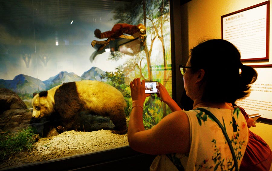 A visitor takes photos of a giant panda specimen at Shanghai History Museum on July 16, 2018. [Photo/Xinhua]