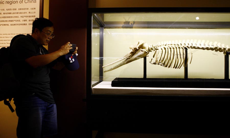 A visitor takes photos of a skeletal specimen of a white-flag dolphin on display at Shanghai History Museum on July 16, 2018. [Photo/Xinhua]