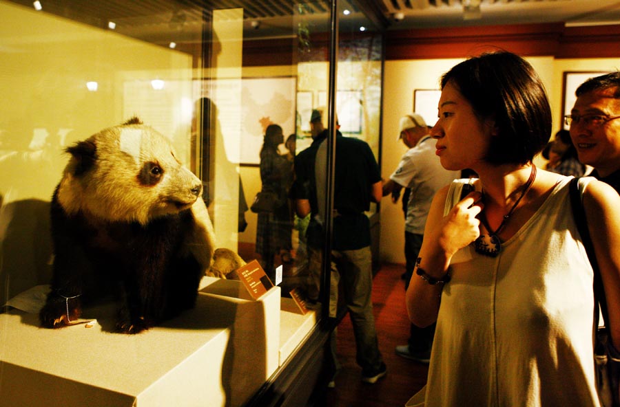 A visitor looks at a giant panda specimen at Shanghai History Museum on July 16, 2018. [Photo/Xinhua]