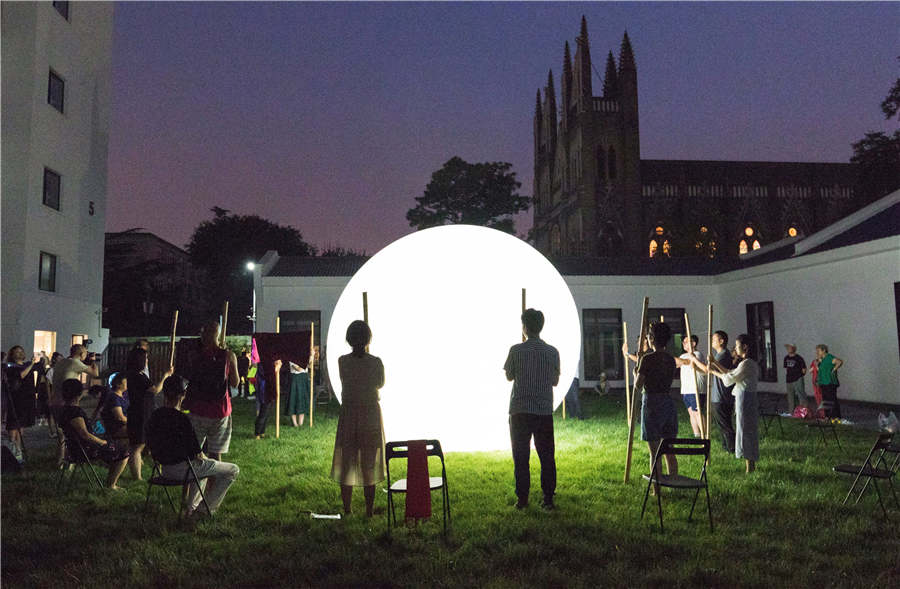 An art performance titled "Everyone comes to dry their clothes in the moonlight" is staged on July 14, 2018. [Photo by Wang Chengmeng/chinadaily.com.cn] |