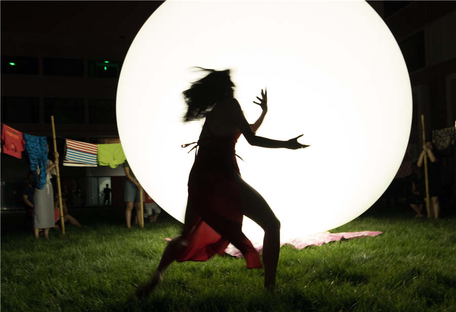 A dancer performs against the background of a "moon". [Photo by Wang Chengmeng/chinadaily.com.cn]