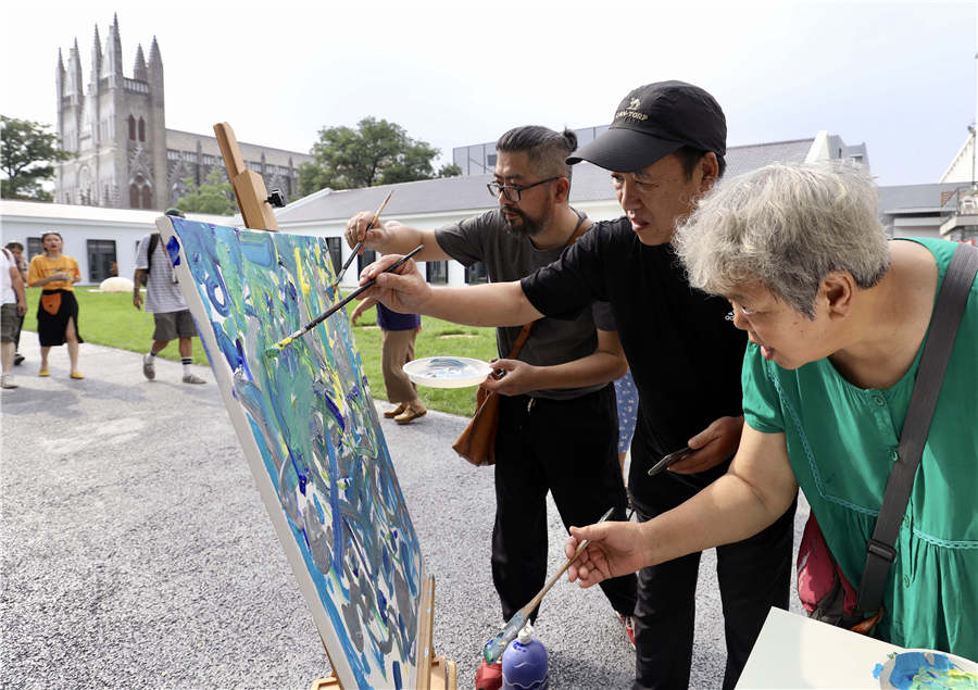 Artists create graffiti with residents at the Xishiku community. [Photo by Zhu Xingxin/chinadaily.com.cn]
