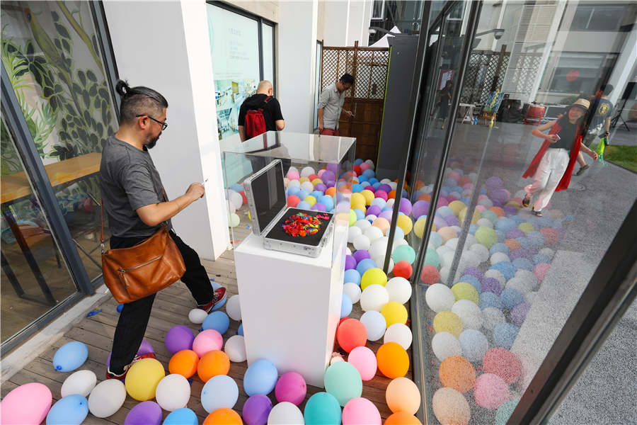 Visitors step on balloons. [Photo by Zhu Xingxin/chinadaily.com.cn]