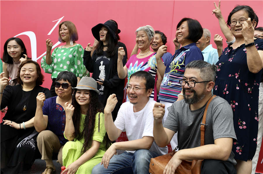 Curator Zhang Bin (front, second from right) poses for a photo with community residents. [Photo by Zhu Xingxin/chinadaily.com.cn]