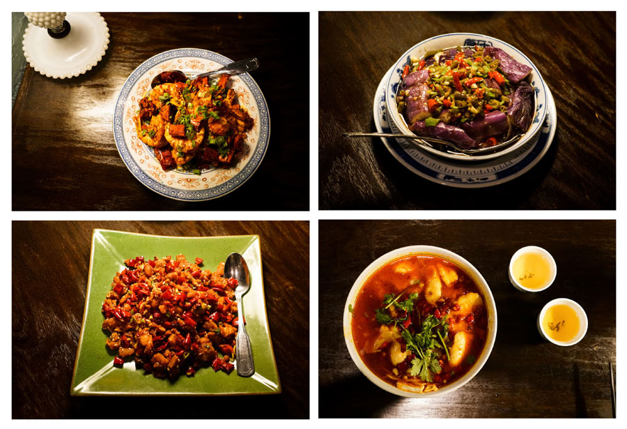 The combined photo shows Kung Fu Shrimp (top L), Sichuan-style eggplants (top R), Chongqing braised fish stew (bottom R) and Chongqing spicy chicken (bottom L) made by Cafe China in New York, the United States, on July 5, 2018. [Photo/Xinhua]