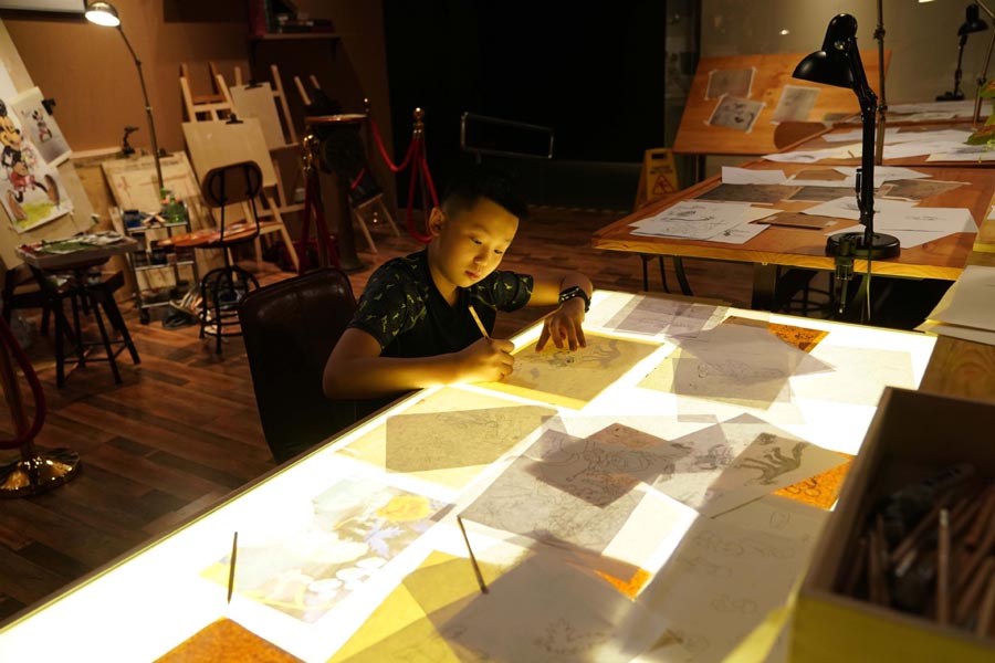 A boy learns to draw cartoons at an animation exhibition at National Museum of Classic Books in Beijing, capital of China, July 23, 2018. Over 400 original animation artworks and celluloid pieces were displayed in this exhibition. [Photo/Xinhua]