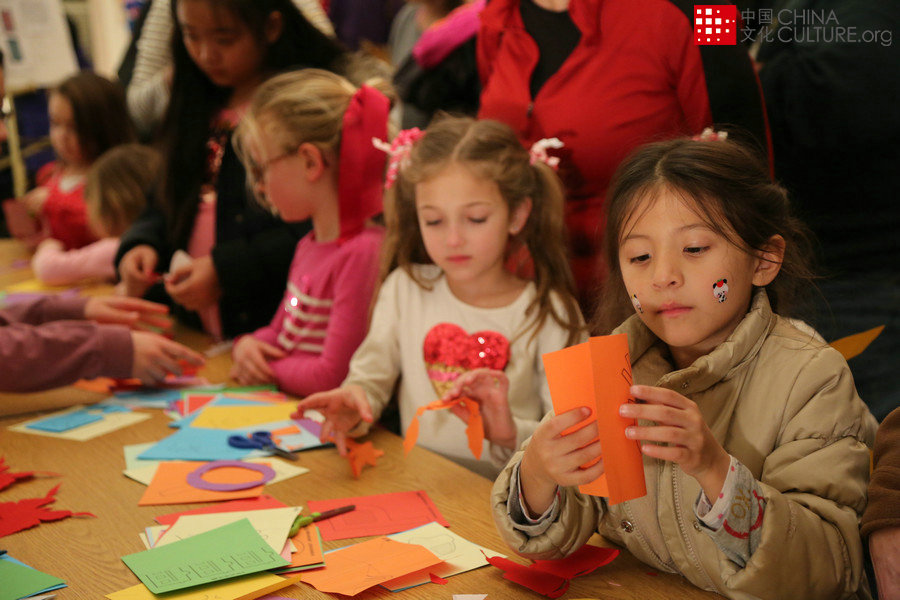 2018年2月14日,“世界藝術(shù)家體驗(yàn)組織”組織在馬里蘭州首府安納波利斯市“創(chuàng)意藝術(shù)中心”舉辦中國新年慶祝活動(dòng)。圖為美國兒童在學(xué)習(xí)剪紙。[攝影:駐美國大使館文化處]