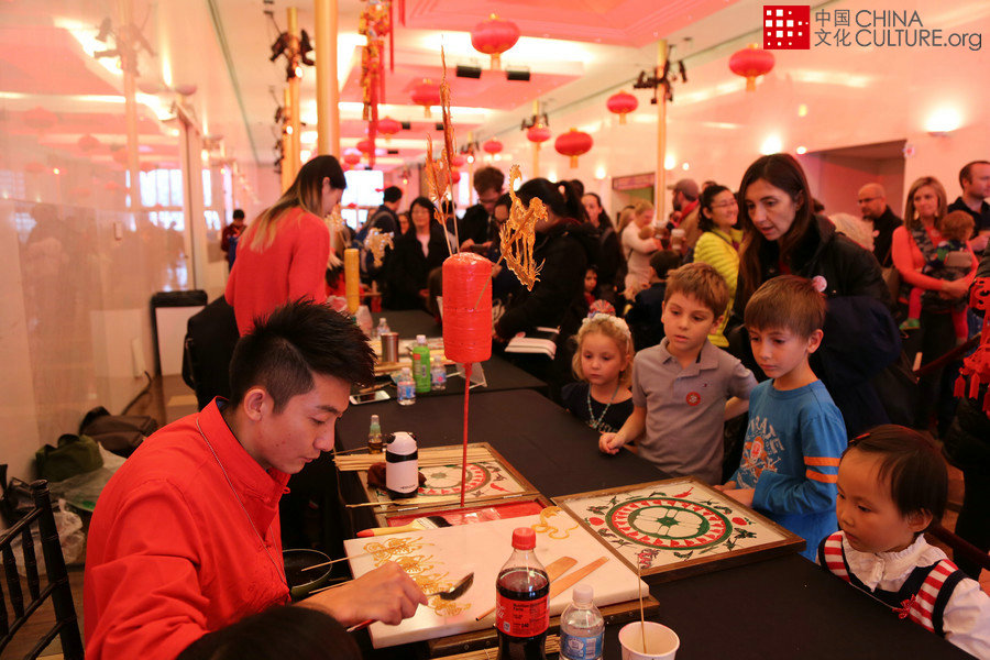 2018年2月17日美國華盛頓肯尼迪表演藝術中心舉辦“中國家庭日”活動。圖為美國兒童在觀看中國成都藝人制作糖畫。[攝影:駐美國大使館文化處]