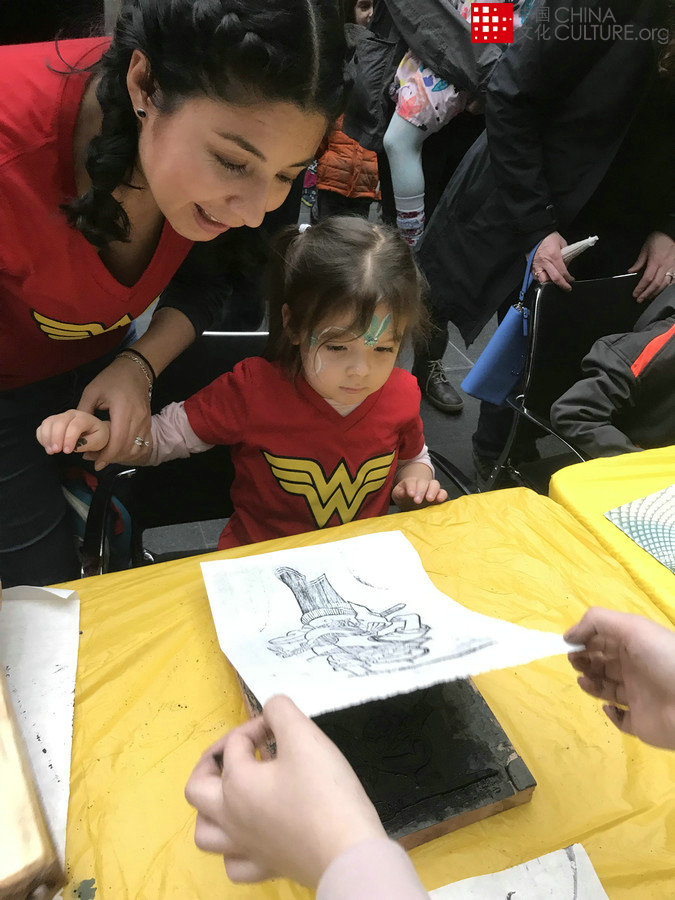 2018年2月10日美國史密森學會美國藝術(shù)博物館舉辦“中國新年家庭日”活動。圖為美國家庭在制作木板年畫。[攝影:駐美國大使館文化處]