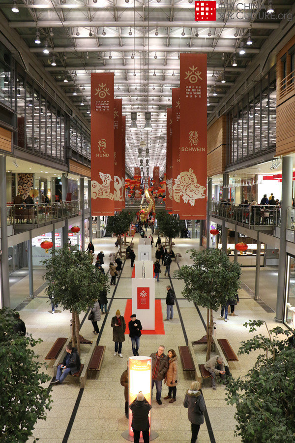 滿是“中國(guó)紅”元素的柏林波茨坦廣場(chǎng)購(gòu)物中心。[攝影:阮佳聞]