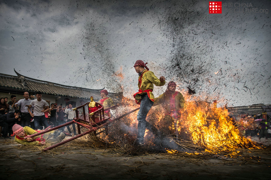 2018年3月3日拍攝于廣東省揭陽市揭東區(qū)灰窯藍(lán)頭村,每年正月十六在村里舉行盛大的跳火墩活動,在祠堂的地堂和馬路上堆起稻草,勇敢的年輕人抬著“圣人”飛奔掠過熊熊燃燒的火堆,彰顯族人的團(tuán)結(jié)、協(xié)作、拼搏、奮進(jìn)的民族精神。