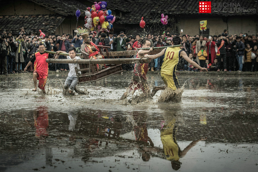 2018年2月27日拍攝于福建省龍巖市長汀縣童坊鎮(zhèn)舉河村 ,每年正月十五期間,村民把關(guān)公塑像抬到泥田里,奔跑打轉(zhuǎn),祈求新的一年五谷豐登,借此增進(jìn)村民之間的感情,場面精彩,熱鬧。