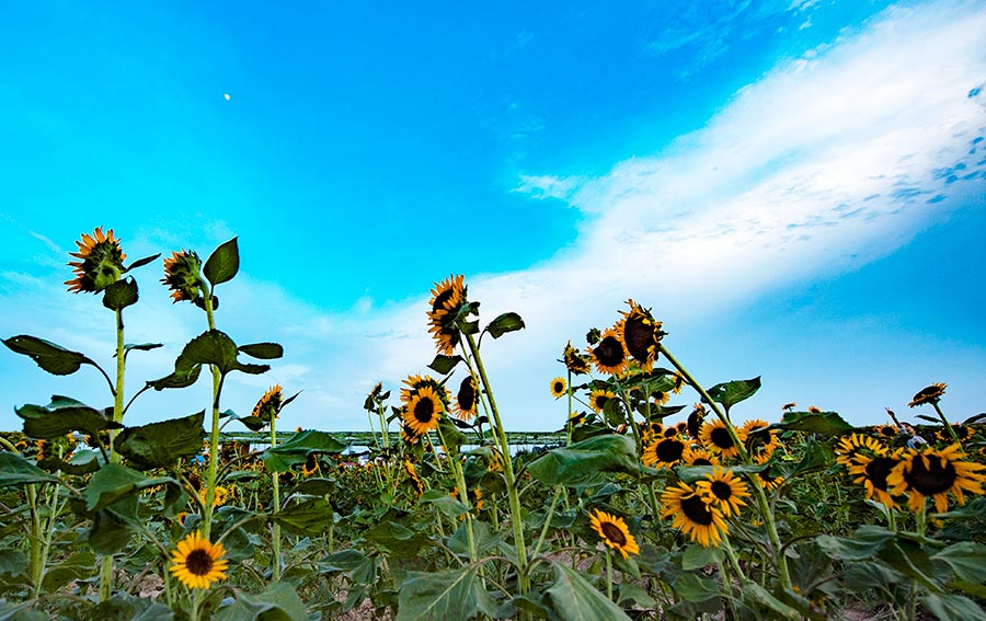 Many visitors were spotted lingering in the sea of sunflowers, zinnias, cosmos and other flowers under the glow of the evening glow in Xinyu county, Jiangxi province on July 22, 2018. [Photo by Zhao Chunliang/China Daily]