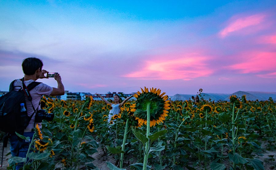 Many visitors were spotted lingering in the sea of sunflowers, zinnias, cosmos and other flowers under the glow of the evening glow in Xinyu county, Jiangxi province on July 22, 2018. [Photo by Zhao Chunliang/China Daily]