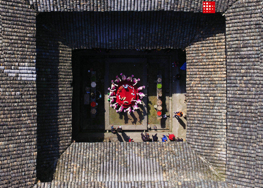 春節(jié)期間(正月十一),一群候場(chǎng)的舞者在老宅內(nèi)排練,恰好被經(jīng)過的無(wú)人機(jī)抓拍到。[攝影:陳碧鑫]