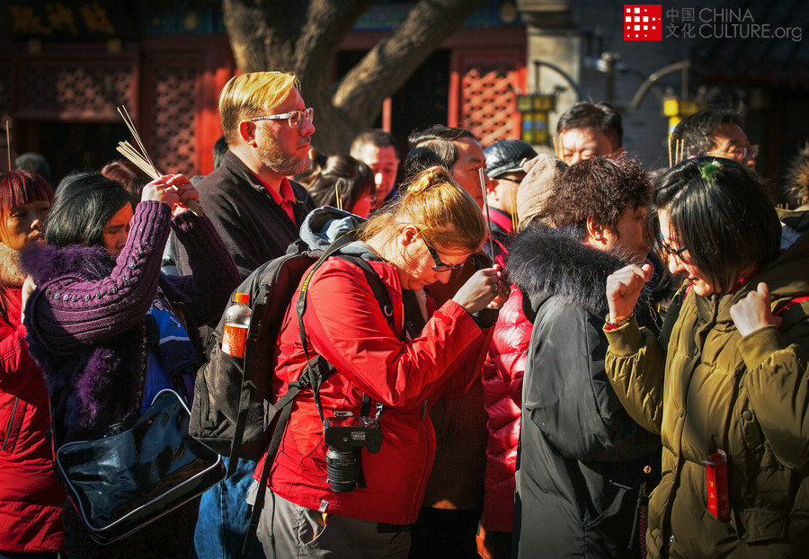 每年正月初一,北京的市民習(xí)慣到白云觀燒香祈福,遠(yuǎn)道而來的外國朋友也加入其中燃香祈福。[攝影:陳風(fēng)檁]